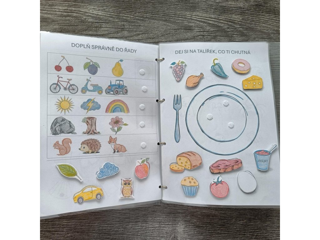 Každá stránka nabízí úkoly s pohyblivými díly na suchý zip. Úkoly jsou zaměřené na rozvoj všeobecných znalostí, pozornosti, prostorové orientace, logického uvažování, rozlišování barev a geometrických tvarů. Též tu najdete první úkoly na počítání, ale i něco pro zábavu, jako je třeba nakládání jídla na talíř.