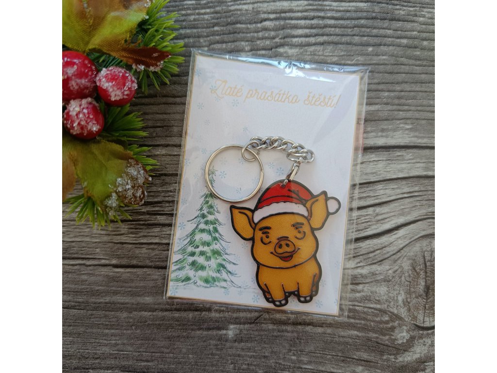 Zlaté vánoční prasátko — klíčenka symbolizující štěstí, vyrobená na 3D tiskárně z odolného materiálu. Ideální dárek pro sebe nebo své blízké.