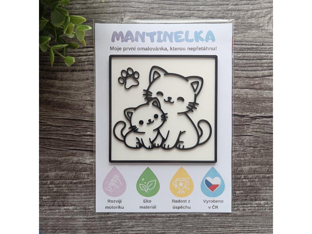 Mantinelka s motivem kočiček je ideální pro každého malého umělce. Díky vystouplým 3D konturám, které fyzicky brání přetahování, se děti mohou plně soustředit na radost z malování. Procvičuje trpělivost, jemnou motoriku a grafomotorické dovednosti.