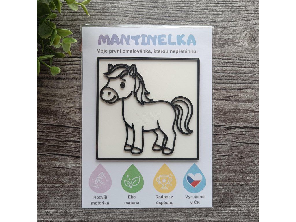 Mantinelka s motivem koníčka je ideální pro každého malého umělce. Díky vystouplým 3D konturám, které fyzicky brání přetahování, se děti mohou plně soustředit na radost z malování. Procvičuje trpělivost, jemnou motoriku a grafomotorické dovednosti.