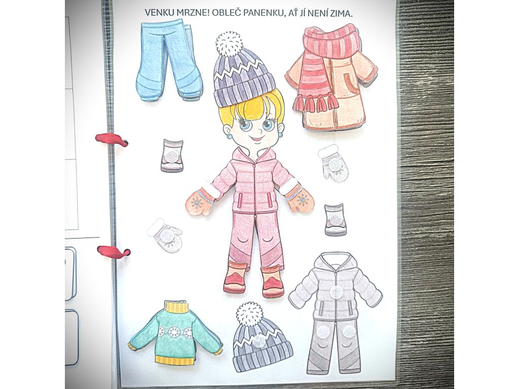 Každá stránka nabízí úkoly s pohyblivými díly na suchý zip. Úkoly jsou zaměřené na rozvoj pozornosti, logického myšlení, rozlišování barev, velikostí a tvarů. Taktéž najdete úkol i na počítání od 1 do 6.